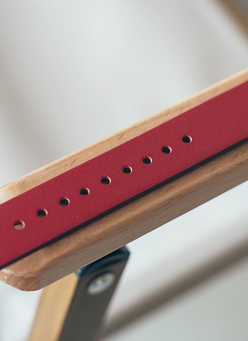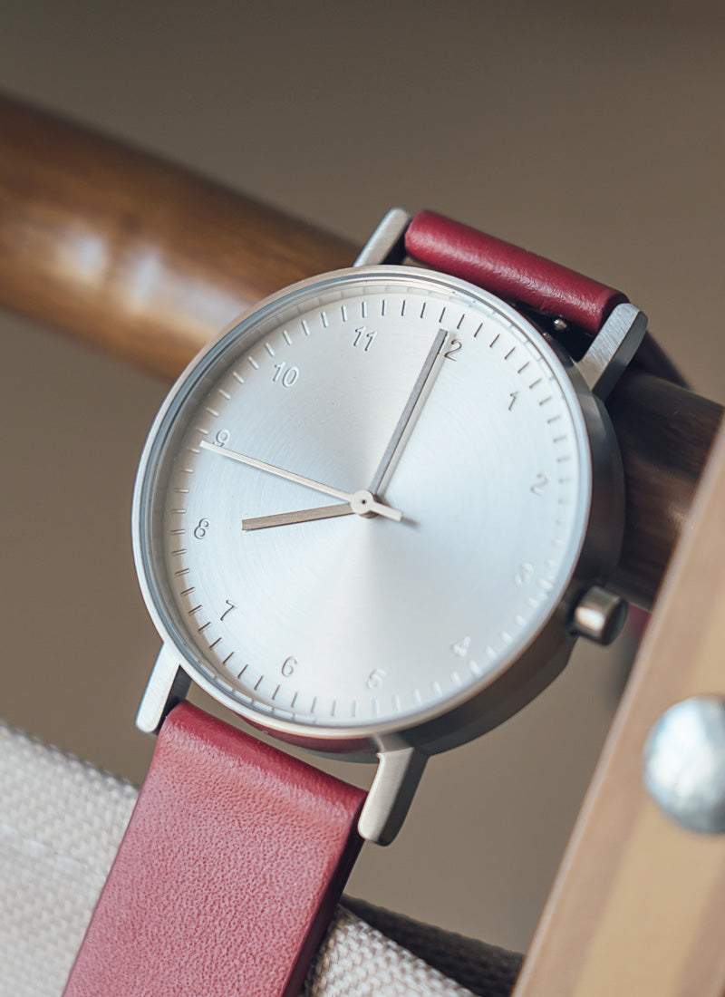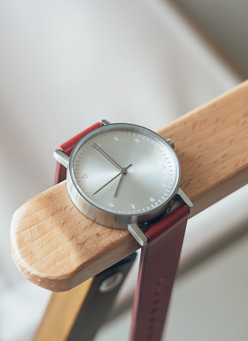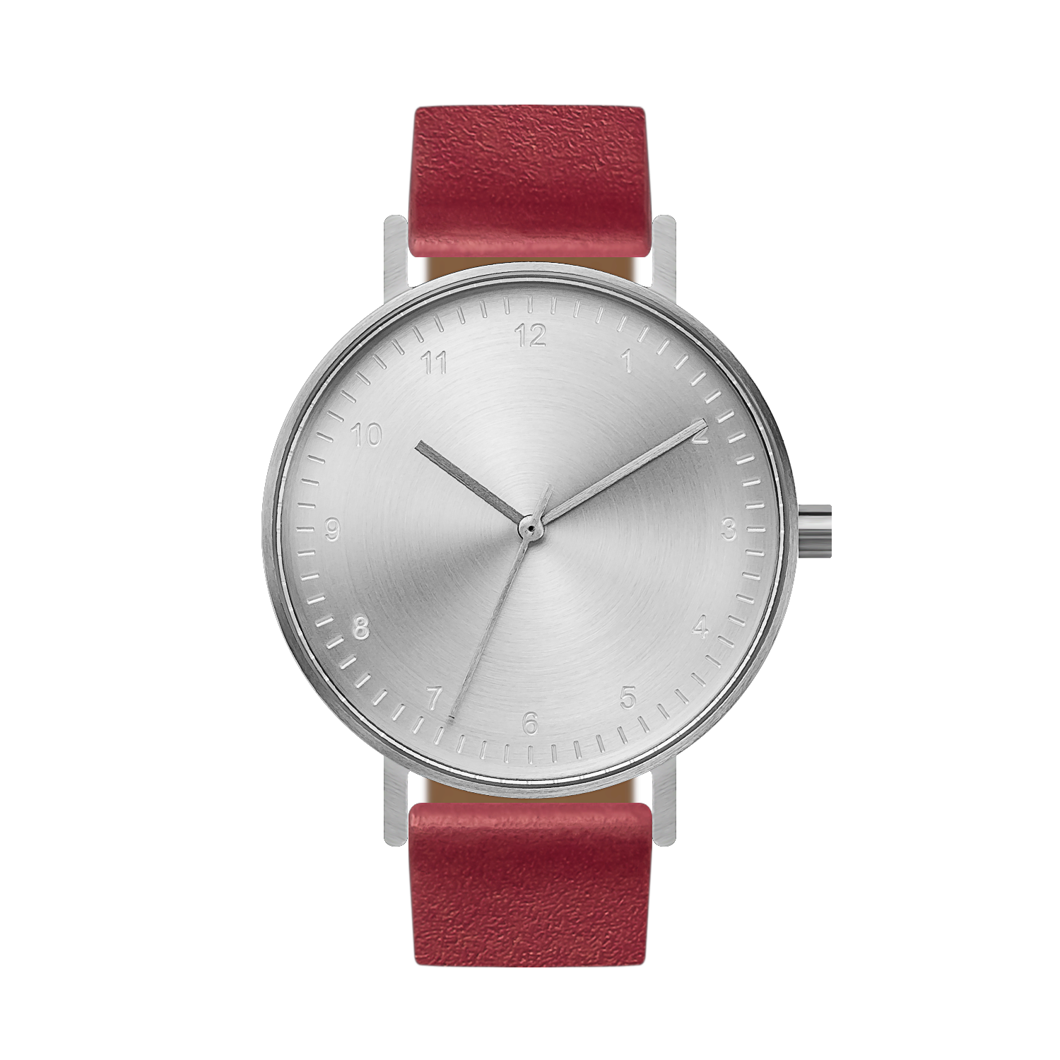 B60 Watch, Silver Case, silver Dial, Leather Strap - Red