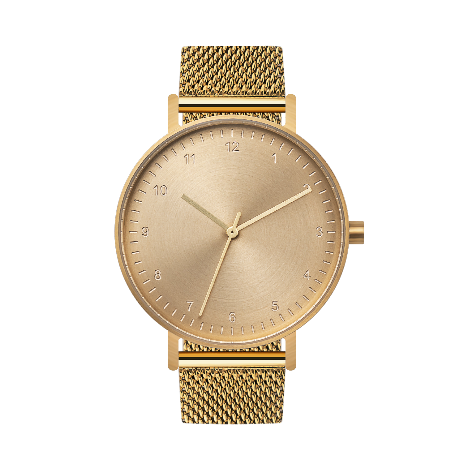Measuring 36mm-40mm in diameter and 7.6mm in thickness, the B60 Watch boasts a gold dial, stainless steel finish, and a stainless steel mesh strap of 18mm width. Powered by a Ronda 763 Swiss Quartz movement, its hardened mineral crystal lens and 3ATM water resistance make it both durable and splash proof. The quick-release springbar additionally allows for easy strap interchangeability.