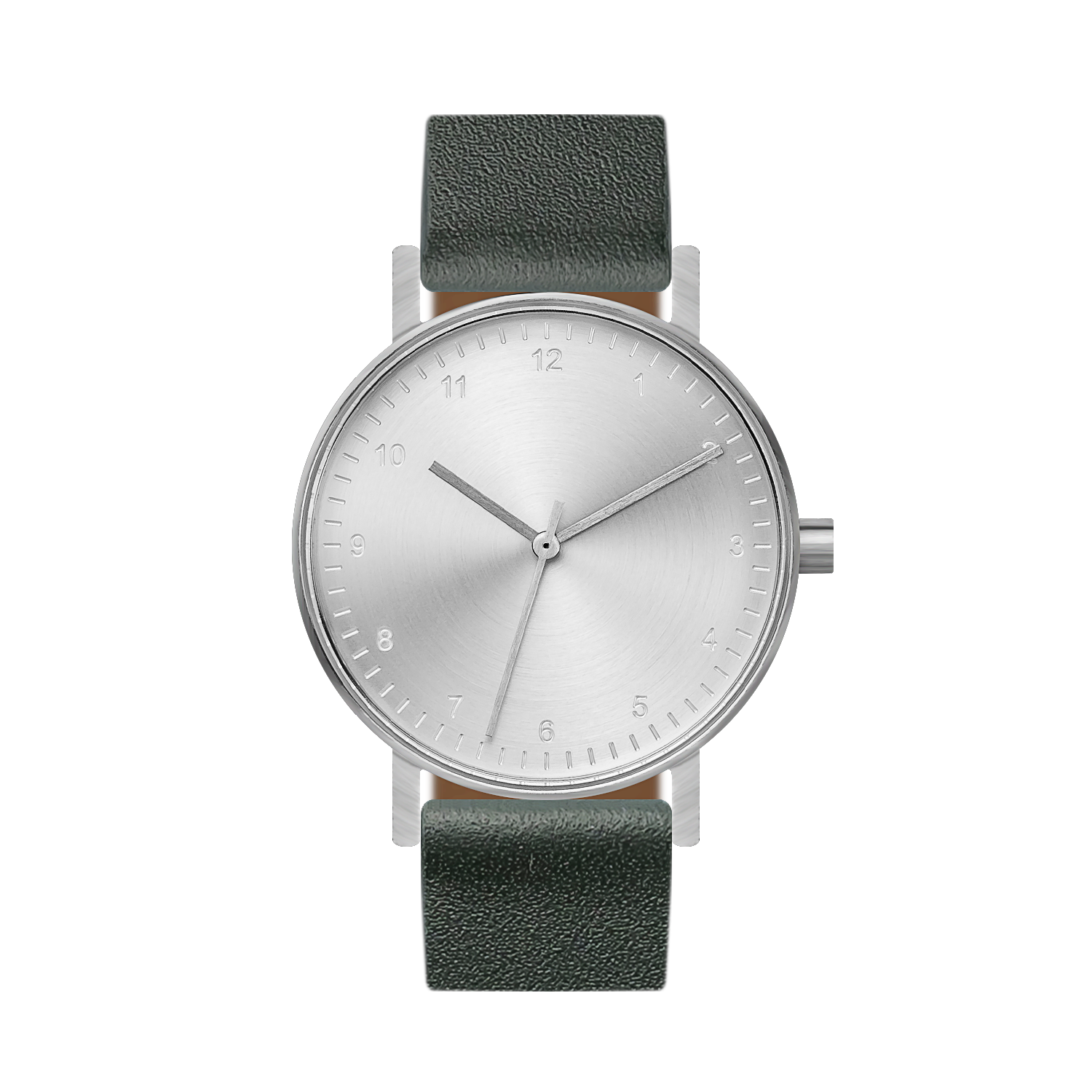 B60 Watch, Silver Case, silver Dial, Leather Strap - Green